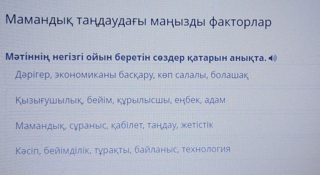 Мамандық таңдаудағы маңызды факторлар Мәтіннің негізгі ойын беретін сөздер қатарын анықта. 4) Дәрігер, экономиканы басқару, көп салалы, болашақ Қызығушылық, бейім, құрылысшы, еңбек, адам Мамандық, сұраныс, қабілет, таңдау, жетістік Кәсіп, бейімділік, тұрақты, байланыс, технология