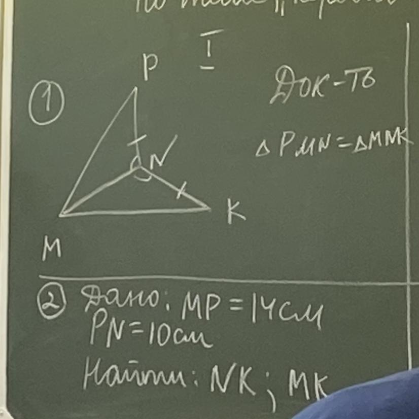 Нам Дано то что MP-14 cm PN-10 сm этот треугольник равнобедренный соответственно MP=MK а PN=NK получается MK=14 cm NK= 10 cm и по 1 признаку равенства треугольника эти треугольники равны.