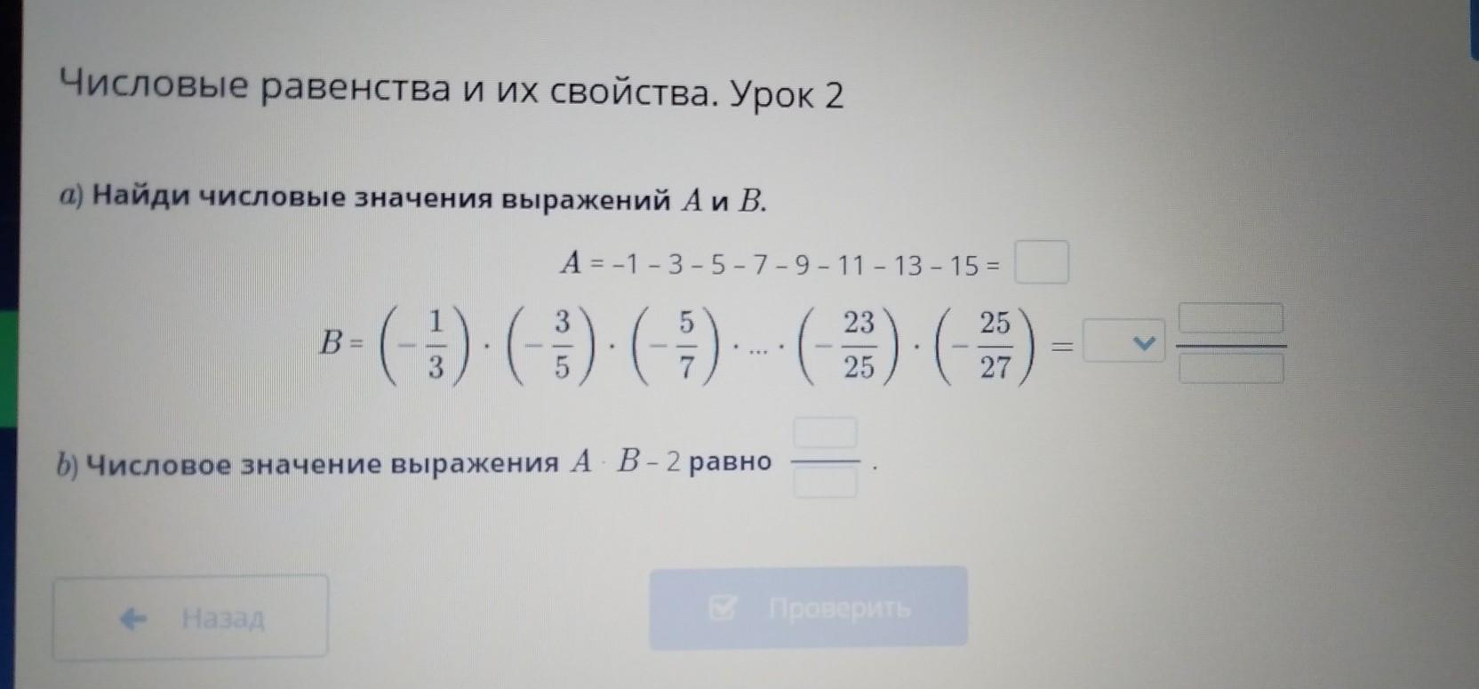 Числовые равенства и их свойства. Урок 2 а) Найди числовые значения выражений и В. 4 =-1-3-5-7-9-11 - 13 - 15 = 5 B- (15) (5) (7) (3) (2) (- 3 5 b) Числовое значение выражения A B- 2 равно е Назад M Проверить
