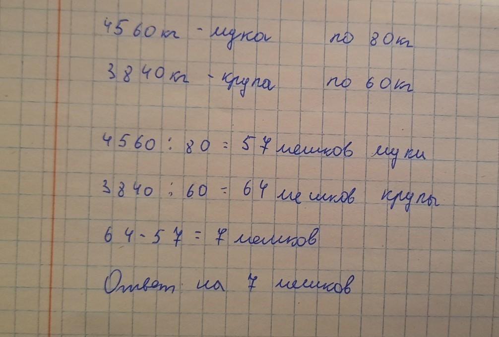 решите задачу пж,с условиями и решением.На склад привезли 4560 кг муки в мешках,по 80 кг в каждом и 3840 кг крупы в мешках,по 60 кг в каждом.На сколько больше привезли мешков с крупой,чем с мукой?