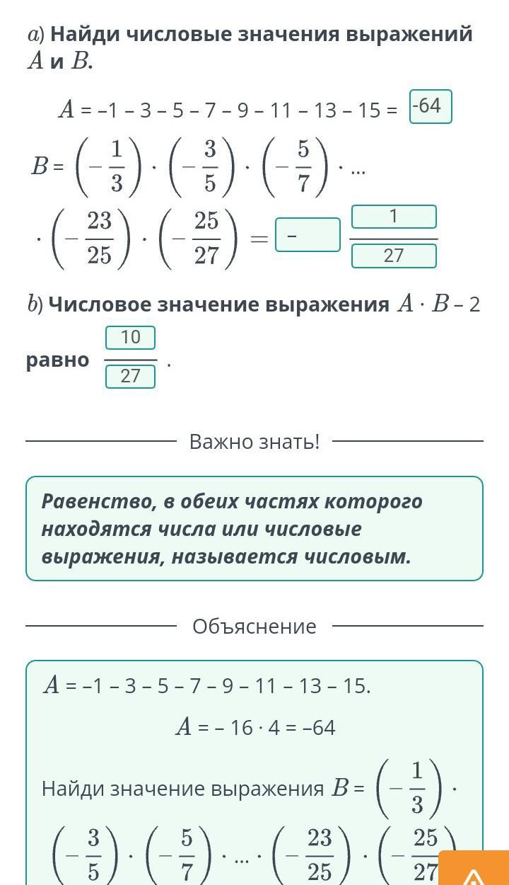 Числовые равенства и их свойства. Урок 2 а) Найди числовые значения выражений А и В. А --1-3- 5-7-9-11-13-15%3D 3 23 25 25 27 b) Числовое значение выражения А . В-2 равно