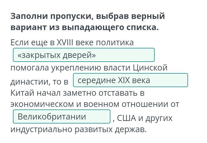 Заполни пропуски, выбрав верный вариант из выпадающего списка. Если еще в XVIII веке политика помогала