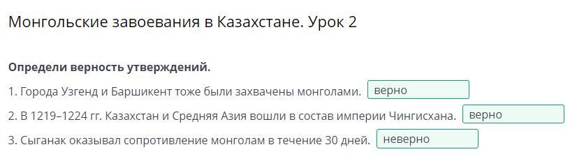 1. Города Узгенд и Баршикент тоже были захвачены монголами - верно\неверно