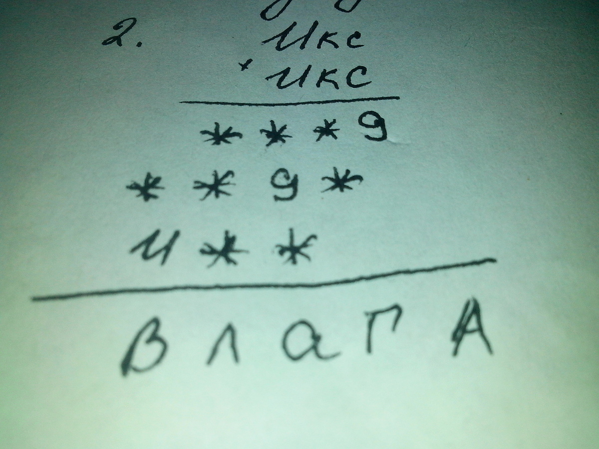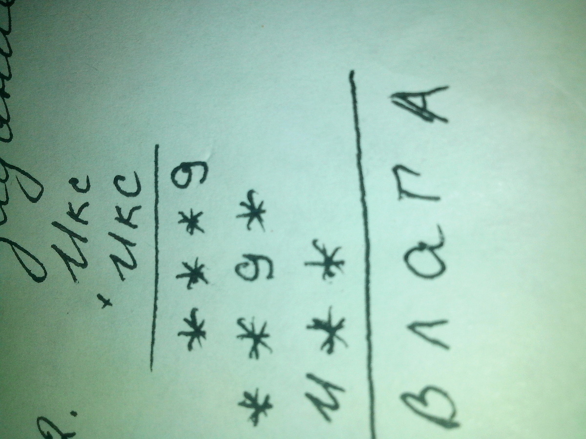 значит 7*7, потом чтобы получить вторую 9 надо к*к, чтобы при сложении с к*с=в конце 9, а это 8 (методом подбора))) получаем на первой строчке в конце 09, на второй 96, можем сложить последние цифры получим 69, так как влага, буква А два раза, и в превом случае =9, то и в ответе третья цифра 9, потом, смотрим, что использовали цифры 8,7,9,6. остались 1,2,3,4,5. необходимо найти число, которое надо умножить на на 7 и умножить на себя, чтобы при сложении столбика получить 9