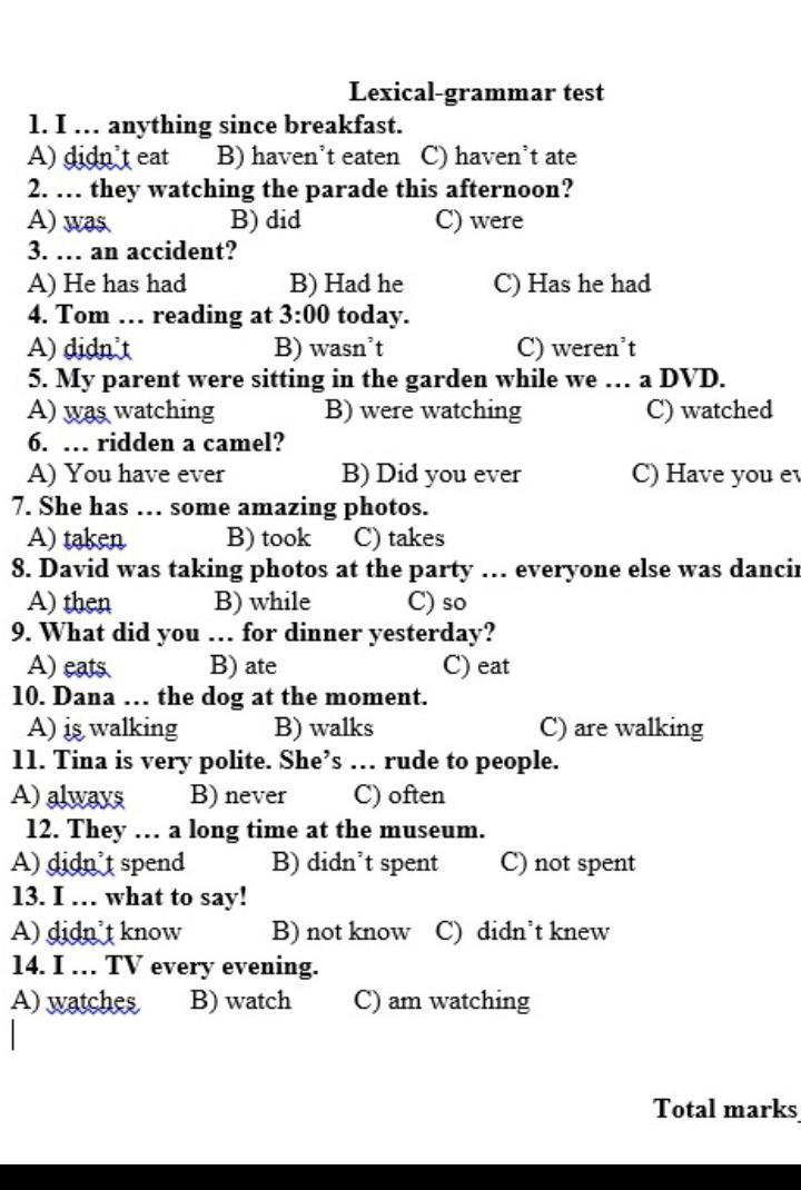 A) was a Lexical grammar test 1. I... anything since breakfast. A) didn't eat B) haven't eaten C) haven't ate 2. ... they watching the parade this afternoon? B) did C) were 3. ... an accident? A) He has had B) Had he C) Has he had 4. Tom ... reading at 3:00 today. A) didn't B) wasn't C) weren't 5. My parent were sitting in the garden while we ... a DVD. A) was watching B) were watching C) watched 6. ridden a camel? A) You have ever B) Did you ever C) Have you ever 7. She has ... some amazing photos. A) taken B) took C) takes 8. David was taking photos at the party ... everyone else was dancing. A) then B) while C) so 9. What did you ... for dinner yesterday? A) cats B) ate C) eat 10. Dana ... the dog at the moment. A) is walking B) walks C) are walking 11. Tina is very polite. She's ... rude to people. A) always B) never C) often 12. They ... a long time at the museum. A) didn't spend B) didn't spent C) not spent 13.I... what to say! A) didn't know B) not know C) didn't knew 14.I ... TV every evening. A) watches B) watch C) am watching Total marks