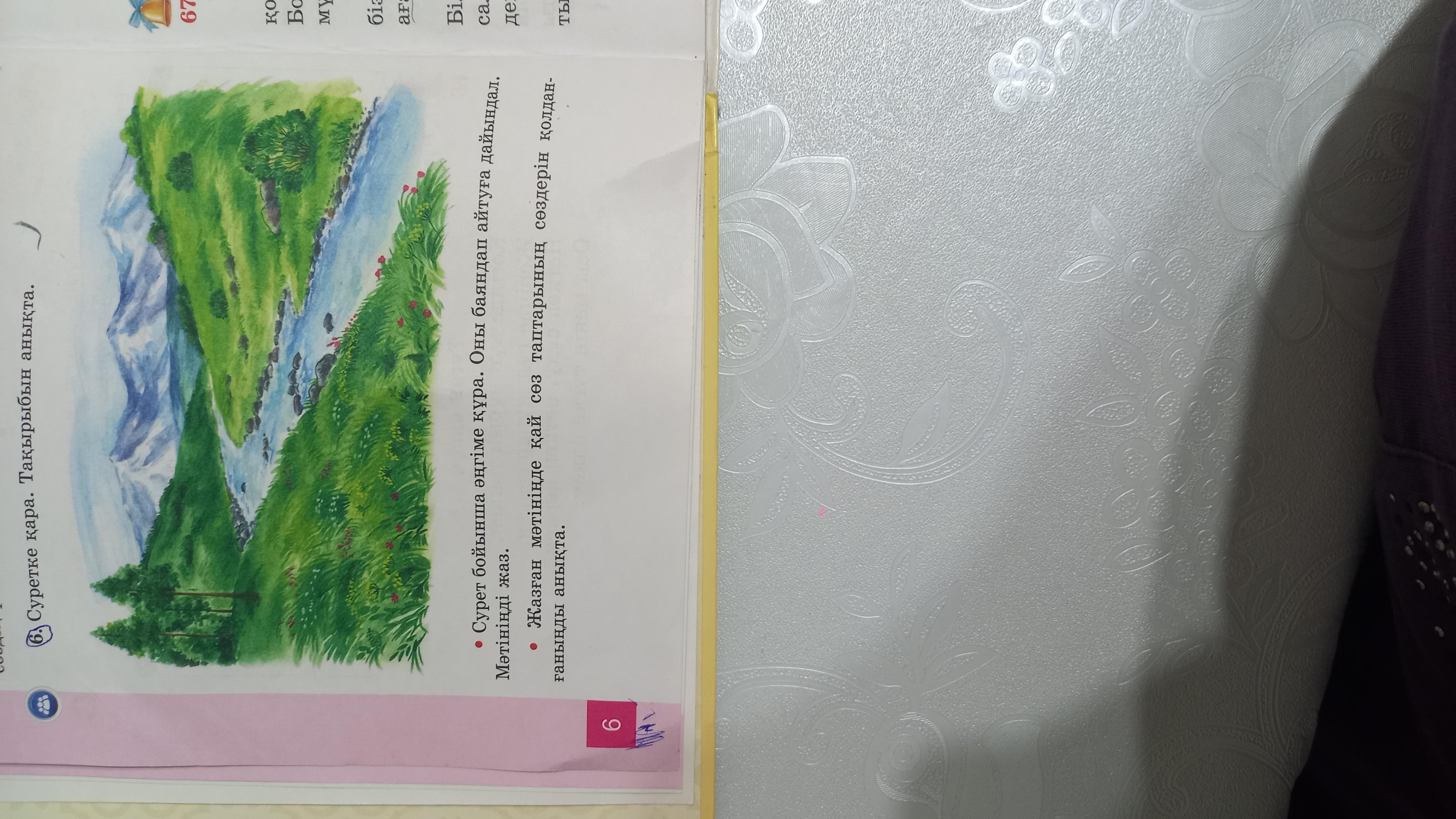 Бұл суретте байтақ дала бинеленген. Жақсыл, жайнап өсіп тұрған шөп, көзді тамсандыратын таулар, таудан аққан мөлдіреген өзен. Осындай әдемі табиғатты көріп тұрмын. Ашық, көк аспанды бейнелегені көрсетіліп тұр.