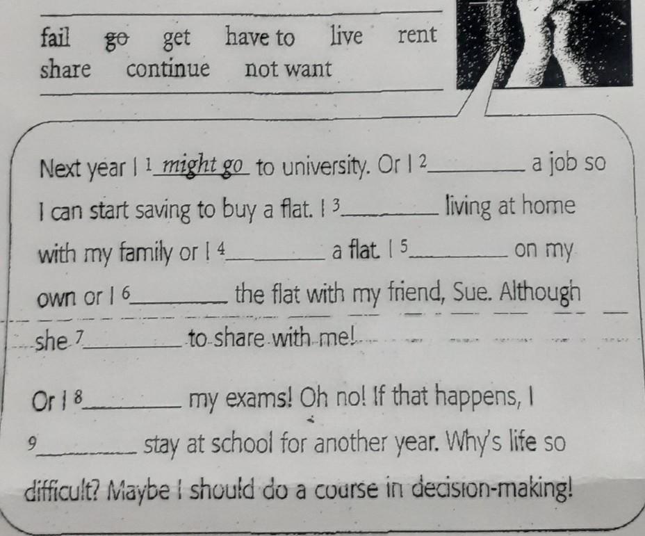 1 GRAMMAR may / might a Mary is 18 and in her final year at school. She's thinking about her future. Complete her thoughts with might and a verb from the box. a rent fail share go get have to live continue not want Next year 11 might go to university. Or 12 a job so I can start saving to buy a flat. 13__living at home with my family or 14 a flat 15 the flat with my friend, Sue. Although - she 7 to share with me! on my Own or 16 "T Or 18 my exams! Oh no! If that happens, 9... stay at school for another year. Why's life so difficult? Maybe I should do a course in decision-making! 9