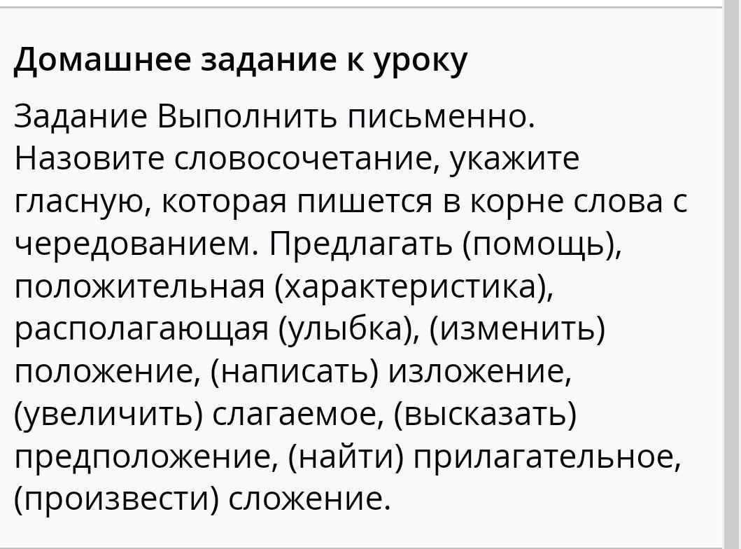 Домашнее задание к уроку Задание Выполнить письменно. Назовите словосочетание, укажите гласную, которая пишется в корне слова с положительная (характеристика), чередованием. Предлагать (помощь), располагающая (улыбка), (изменить) положение, (написать) изложение, (увеличить) слагаемое, (высказать) предположение, (найти) прилагательное, (произвести) сложение.