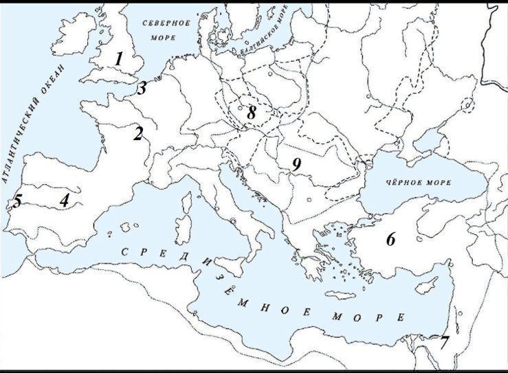 Задание по карте. Укажите, какими цифрами отмечена территории, на которой происходил процесс, запомнившийся нам как «Реконкиста», и где происходила война Алой и Белой розы?