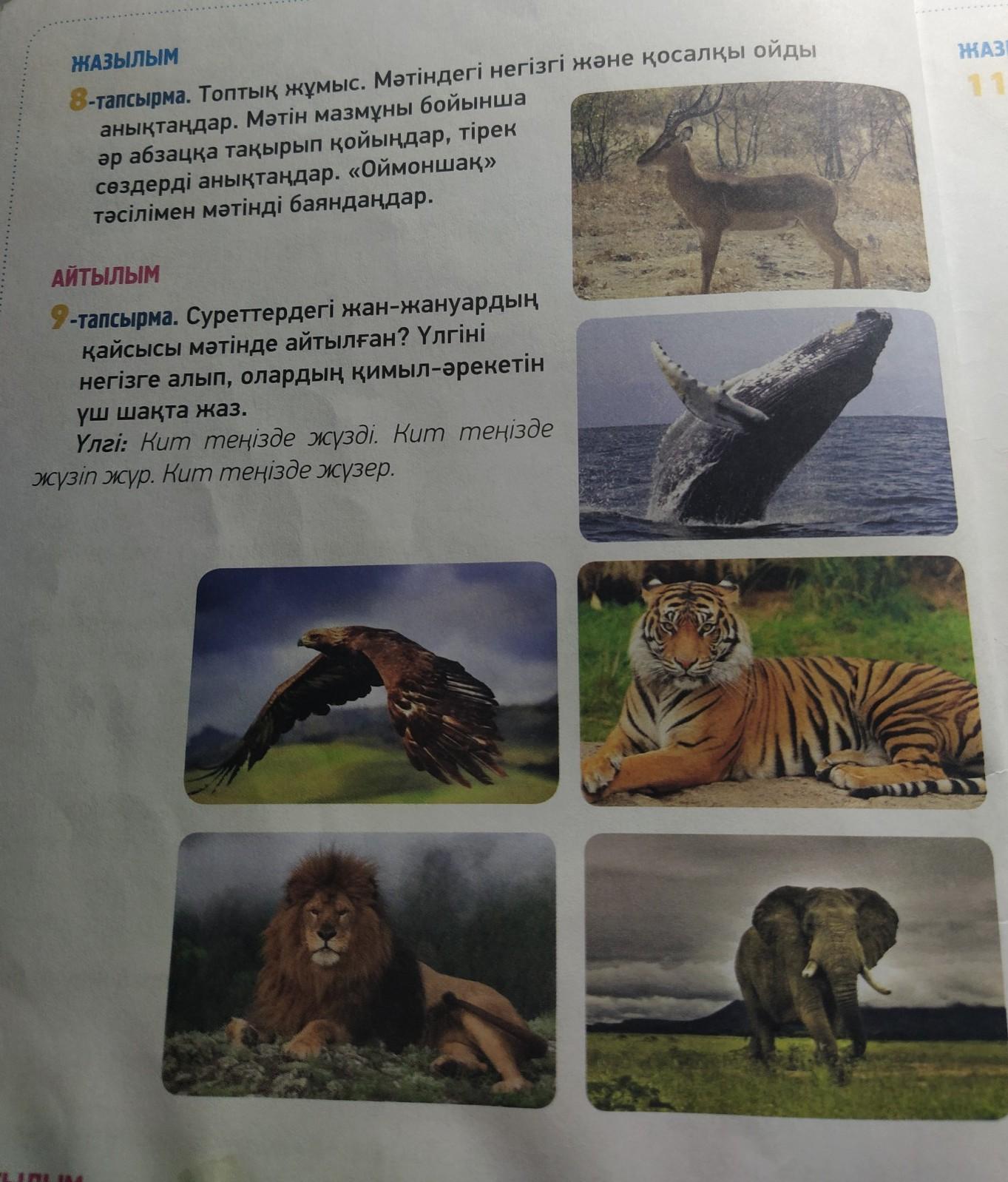 АЙТЫЛЫМ 9-тапсырма. Суреттердегі жан-жануардың қайсысы мəтінде айтылған? Үлгіні негізге алып, олардың қимыл-әрекетін үш шақта жаз. Үлгі: Ким теңізде жүзді. Кит теңізде жүзіп жүр. Кит теңізде жүзер. пожалуйста помогите!!!!