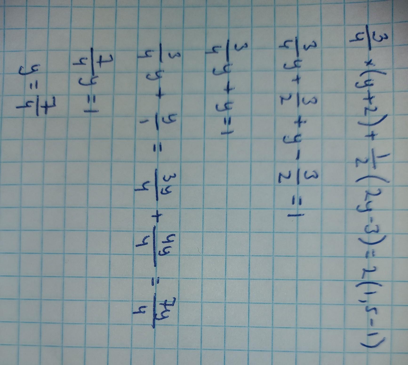 найди корень уровнения 3/4(у+2)+1/2(2у-3)=2(1,5-1)