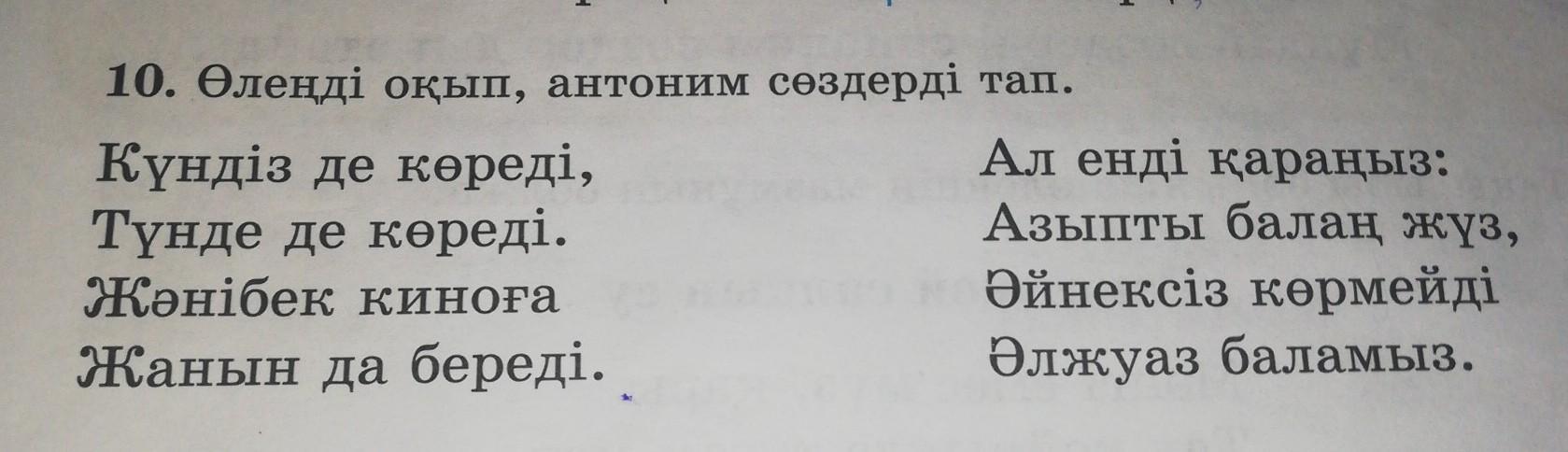 10. Өлеңді оқып, антоним сөздерді тап. Күндіз де көреді, Ал енді қараңыз: Түнде де көреді. Азыпты балаң жүз, Жәнібек киноға Әйнексіз көрмейді Жанын да береді. Әлжуаз баламыз.