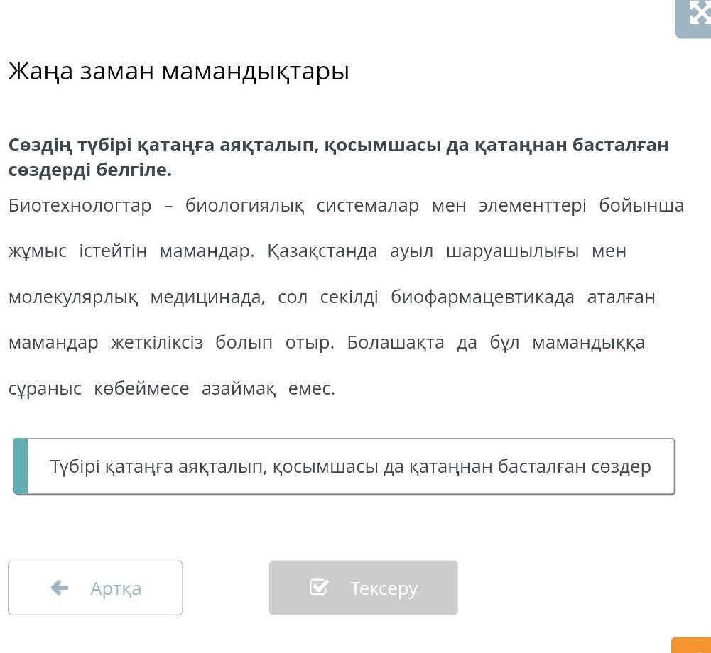 Жаңа заман мамандықтары Сездің түбірі қатайға аяқталып, қосымшасы да катаннан басталған сездердi белгiле. Биотехнологтар - биологиялык системалар мен элементтері бойынша жұмыс істейтін мамандар. Қазақстанда ауыл шаруашылығы мен молекулярлық медицинада, сол секiлдi биофармацевтикада аталған мамандар жеткіліксіз болып отыр. Болашақта да бұл мамандыққа сұраныс көбеймесе азаймақ емес. Тубiрi қатаңга аякталып, қосымшасы да катаннан басталған сөздер помогите