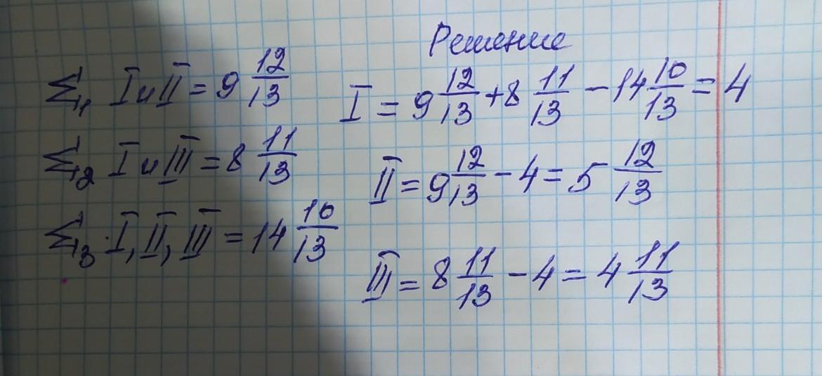 3) Сумма трёх чисел равняется 14 10/13 , причем сумма первого и другого чисел равняется 9 12/13 , а сумма первого и третьего 8 11/13. Найди эти числа.