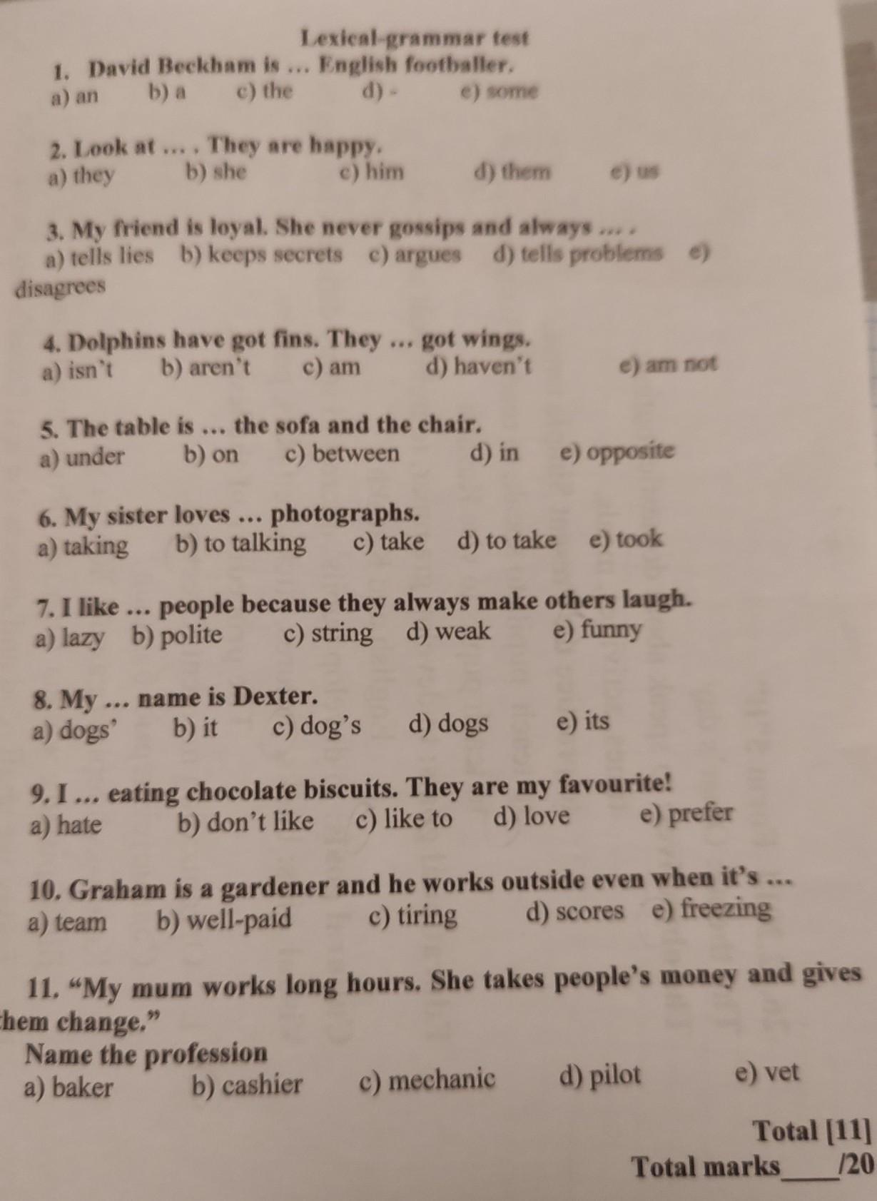 Lexical grammar tent 1. David Beckham in ... English footballer a) an ba c) the 2). e) Nome 2. Look at... They are happy, a) they b) she o) him d) them e) us 3. My friend is loyal. She never gossips and always .... a) tells lies b) keeps secrets ) argues d) tells problems e) disagrees 4. Dolphins have got fins. They ... got wings. a) ian'i b) aren't c) am ) haven't e) am not "nation eball from a very eir own baseball ne another in two teams of d-shaped field Fourite baseball am colours 8. The table is ... the sofa and the chair, a) under b) on ®) between d) in e) opposite 6. My sister loves ... photographs. a) taking b) to talking e) take d) to take ) took % I like ... people because they always make others laugh, a) lazy b) polite e) string d) weak e) funny 8. My... name is Dexter a) dogs' bit c) dog's d) dogs e) its 9.1... enting chocolate biscuits. They are my favourite! a) hate b) don't like ) like to d) love e) prefer 10. Graham is a gardener and he works outside even when it's .... a) team b) well-paid e) tiring d) scores e) freezing 11. "My mum works long hours. She takes people's money and gives them change." Name the profession a) baker b) cashier e) mechanic d) pilot e) vel 197 Total 111 Total marks 120