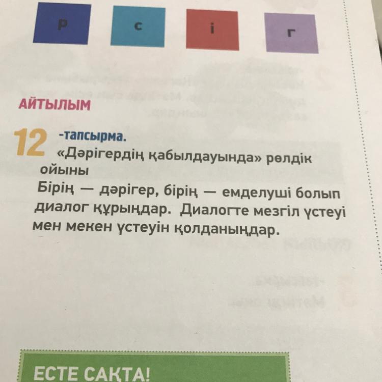 Бірің — дәрігер, бірің — емделуші болып диалог құрыңдар. Диалогте мезгіл үстеуі мен мекен үстеуін қолданыңдар.