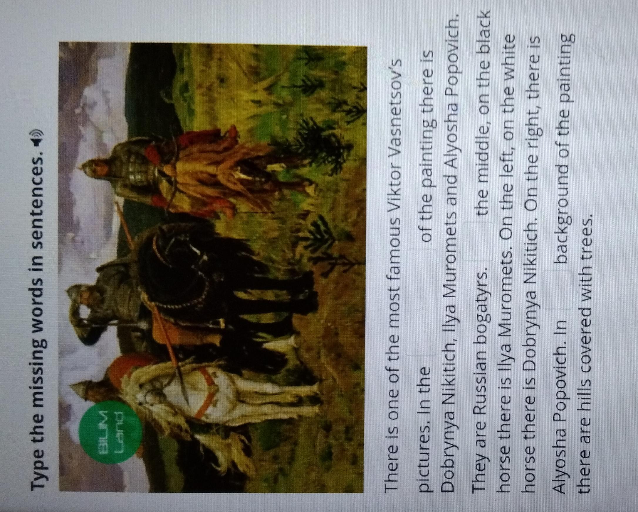 There is one of the most famous Viktor Vasnetsov’s pictures. In the ____ of the painting there is Dobrynya Nikitich, Ilya Muromets and Alyosha Popovich. They are Russian bogatyrs. ____ the middle, on the black horse there is Ilya Muromets. On the left, on the white horse there is Dobrynya Nikitich. On the right, there is Alyosha Popovich. In ____ background of the painting there are hills covered with trees.