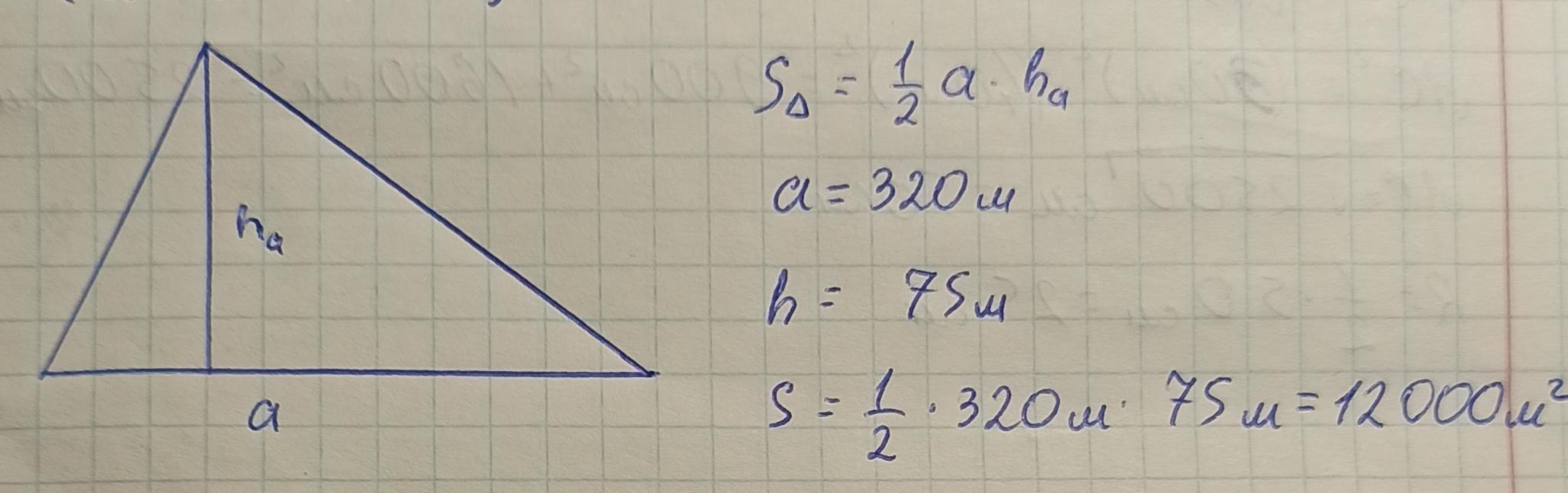 одна сторона треугольного участка земли равна 320 метров. Проведённая к ней высота равна 75 метров. Вычислите площадь земельного участка