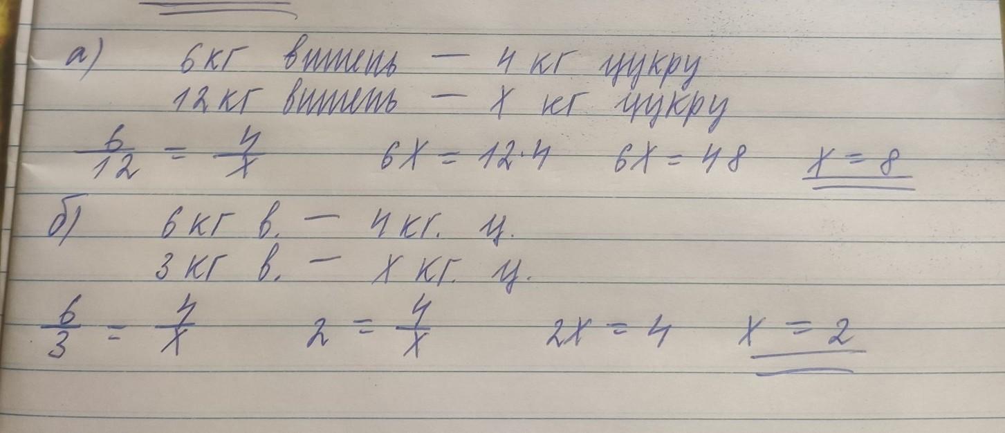 2. Розв'яжи задачу на знаходження четвертого пропорційного. Для приготування варення до 6 кг ви- шень додають 4 кг цукру. Скільки кілогра- мів цукру потрібно для приготування такого варення: а) з 12 кг ягід; б) з 3 кг ягід?