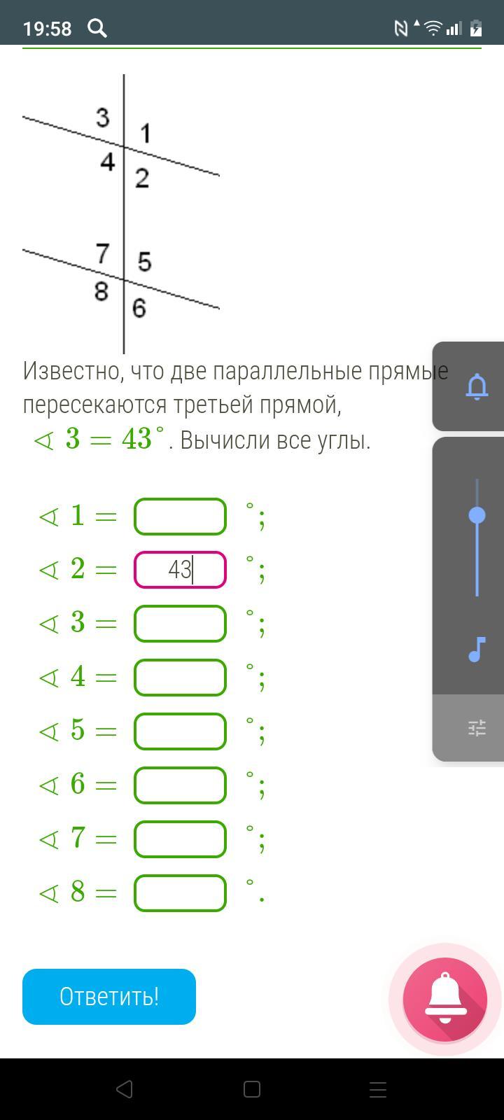 Угол 2=43° (углы 2 и 3-вертикальные)