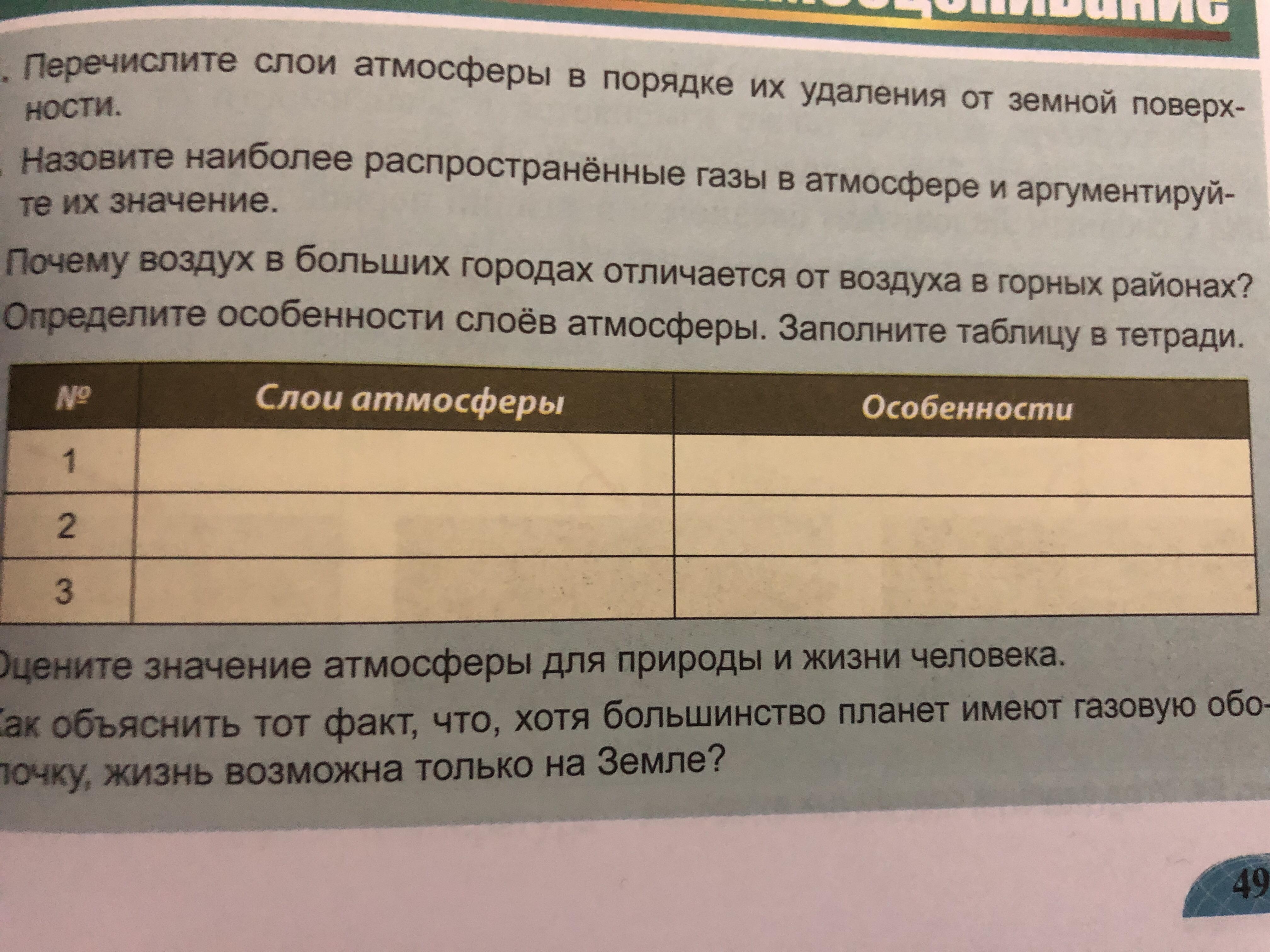 Определите особенности слоёв атмосферы. Заполните таблицу в тетрадь .