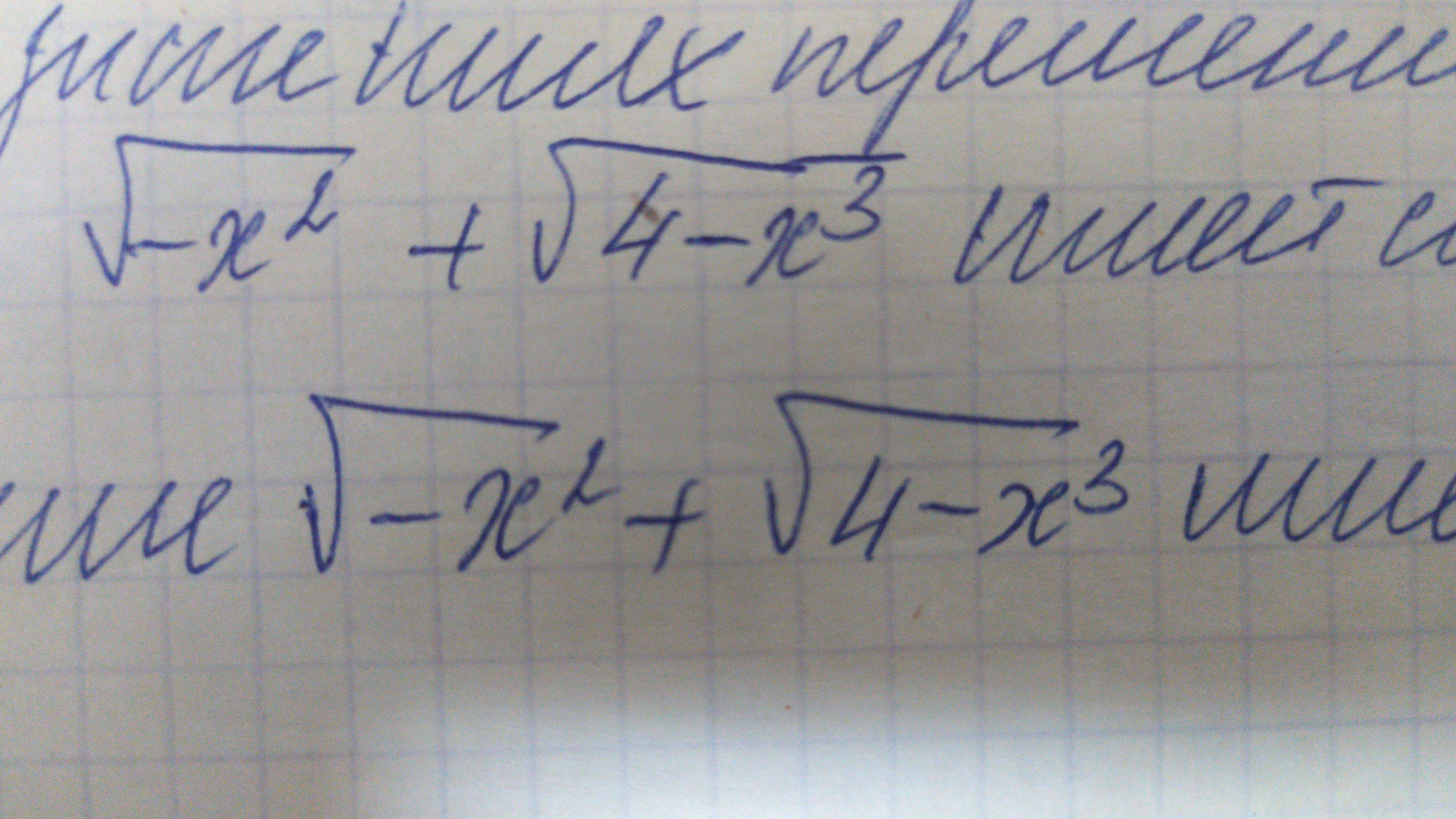 Если запись как у вас в тетради, то нет ни одного значения Х, при котором данное выражение имеет смысл! Уже в первом подкоренном выражении видно, что какой бы мы Х не взяли (положительный или отрицательный), под знаком корня будет отрицательное число, а это НЕ ВЕРНО!
