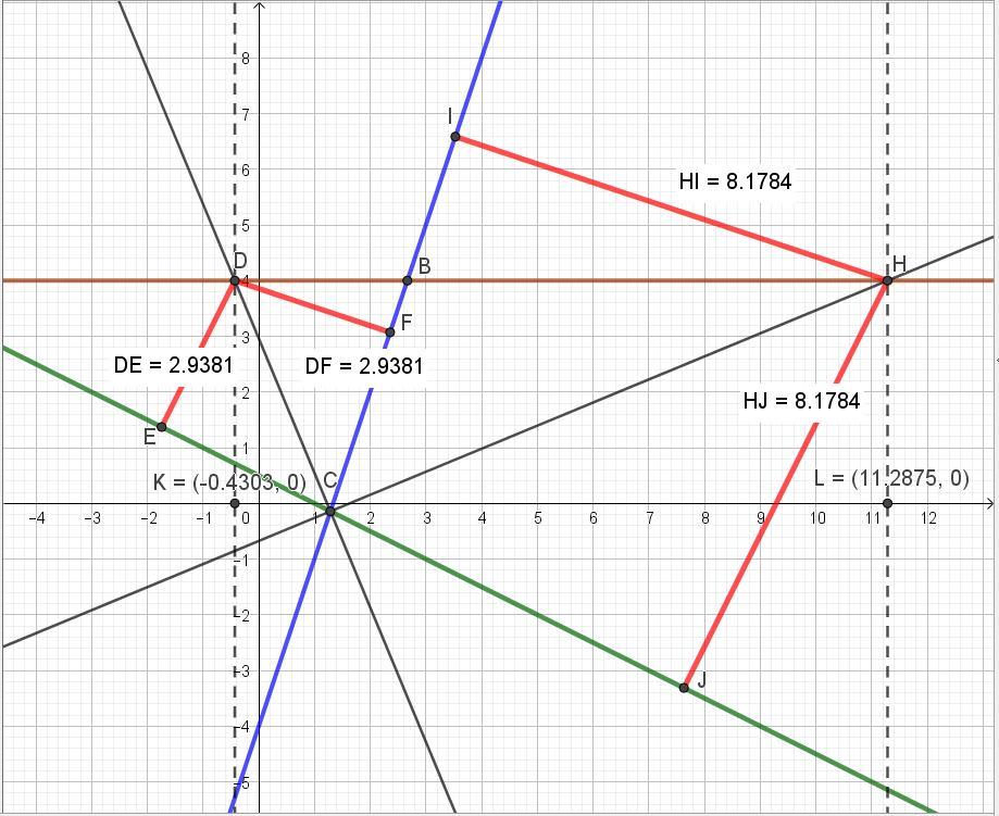 (3x–4-4)/√(3²+(-1)²) = (x+2*4-1)/√(1²+2²)