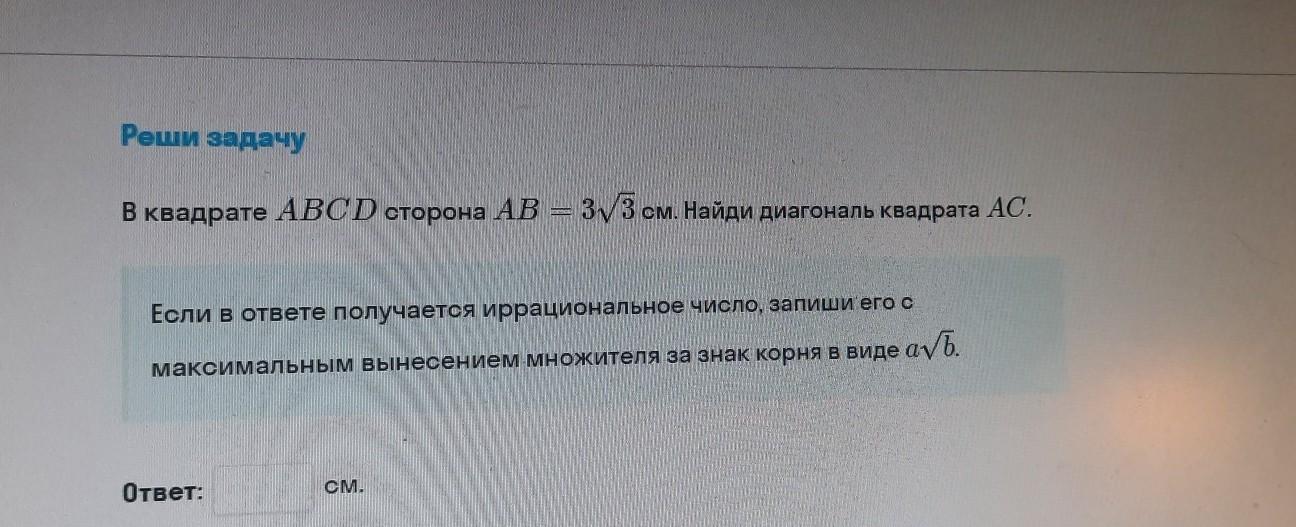 В условии даётся квадрат, со стороной 3√3. Нужно найти диагональ. Решаем по теореме Пифагора: а^2+b^2=c^2