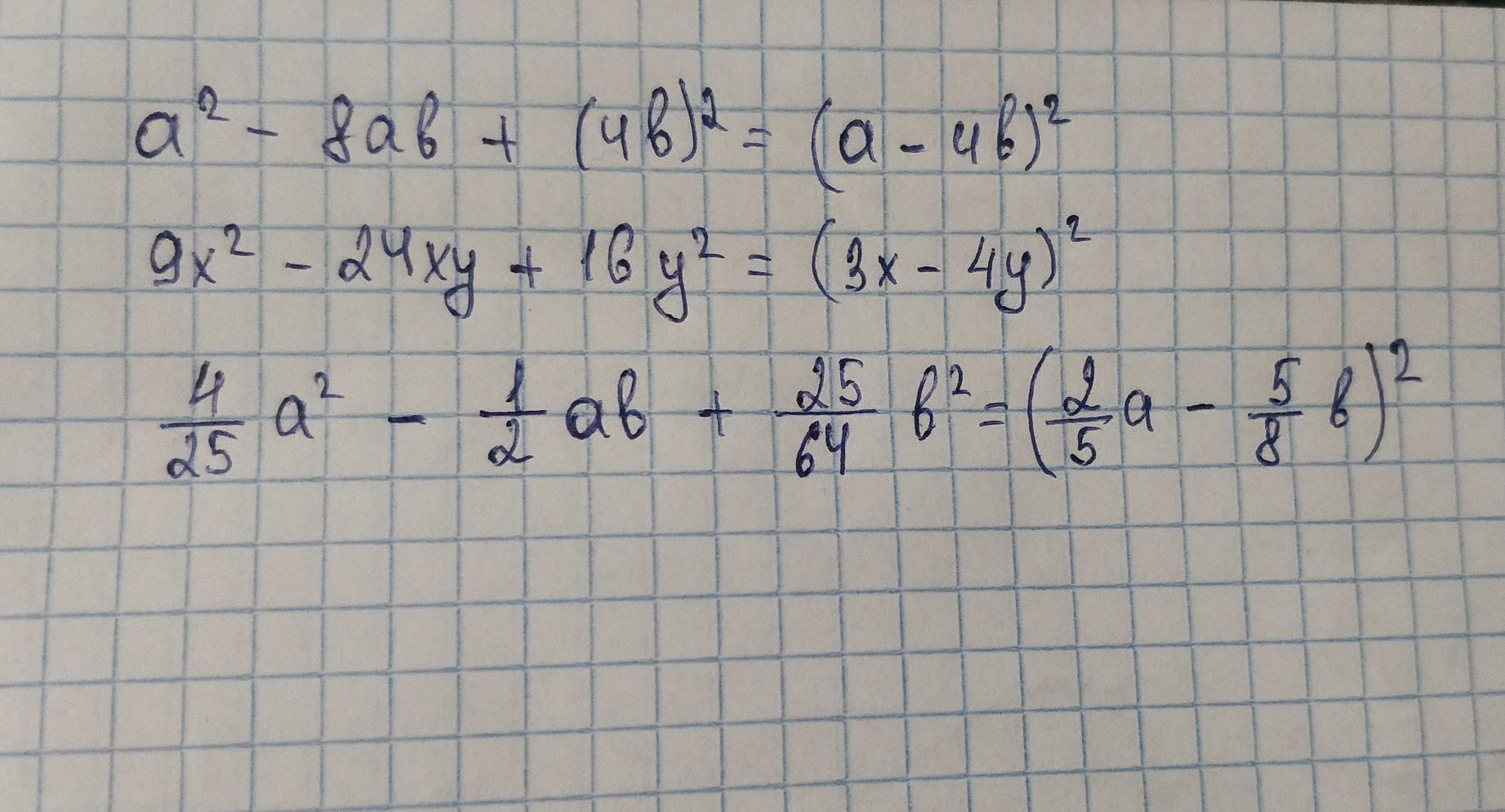 в первом примере берём первое и третье слагаемое без квадрата, между ними ставим знак, который в условии у второго слагаемого. второй пример. 9х²=(3х)², 16у²=(4у)². берём 3х и 4у. между ними знак из условия посередине, у второго слагаемого.