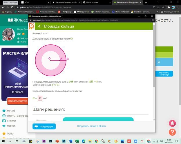 Площадь меньшего круга равна 108 см2. Отрезок АВ = 8 см. Значение П = 3