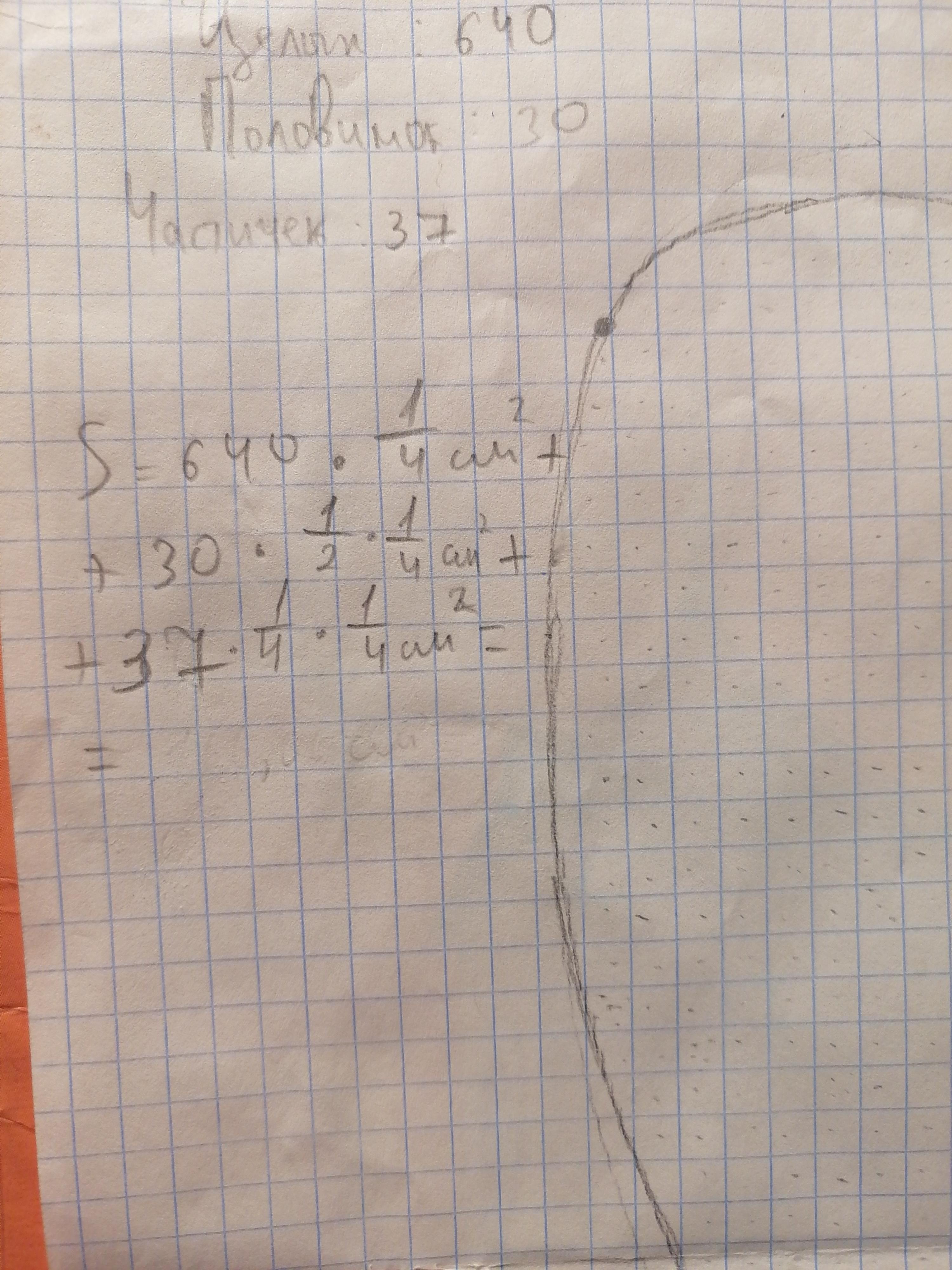 S=640*1/4 см в квадрате +30*1/4*1/2см в квадрате +37*1/4*1/4 см в квадрате =..... см в квадрате =...... м в квадрате