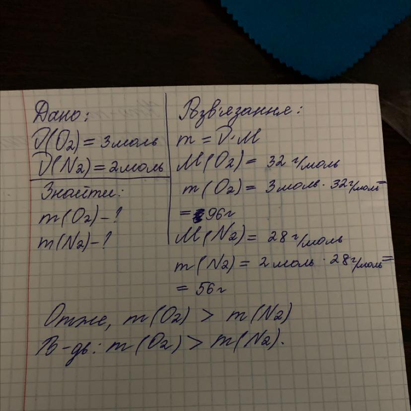 обчисліть маса якого із зразків речовини більша: 3 моль кисню чи 2 моль азоту