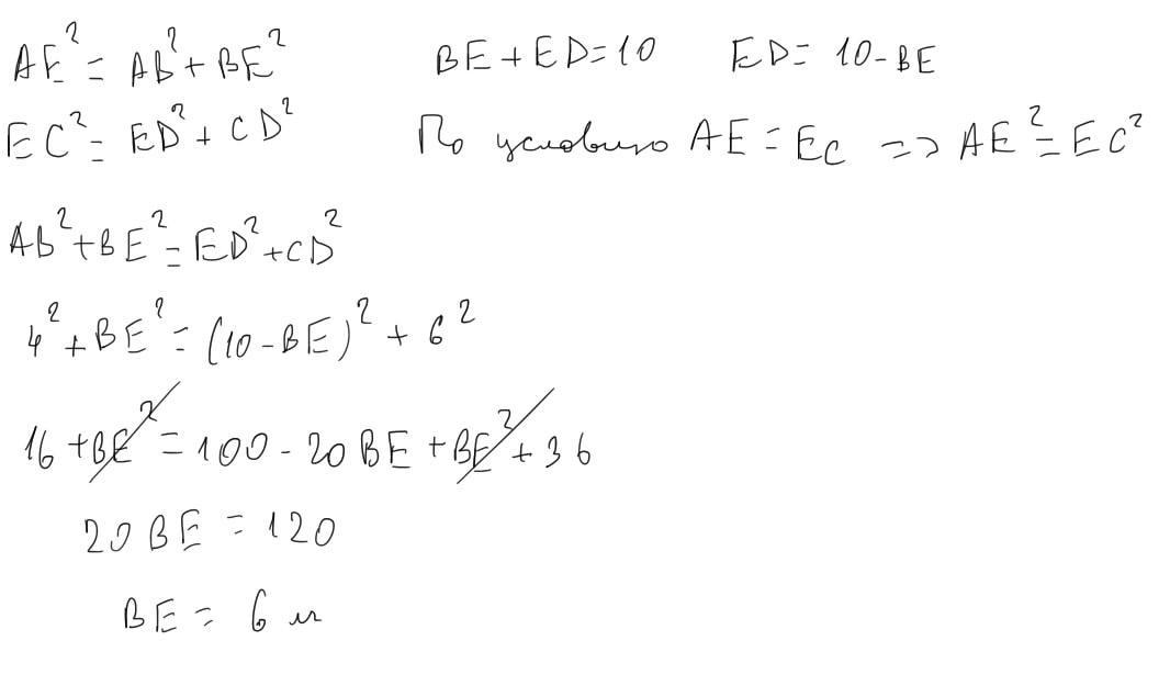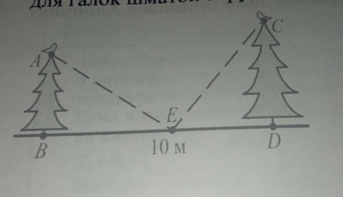 Hа верхівках двох ялинок сидять дві галки. Висота ялинок дорвнює 4 м і 6м, а вдстань між ними- BD = 10 м. На якй відстані ВЕ потрібно покласти для галок шматок сиру, щоб відстань від них до сиру була однакова?