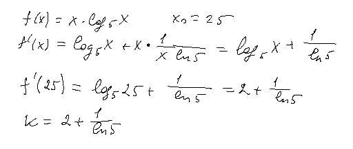 Кутовий коефіцієнт дотичної дорівнює похідній функції в точці дотику, тобто в точці х=25
