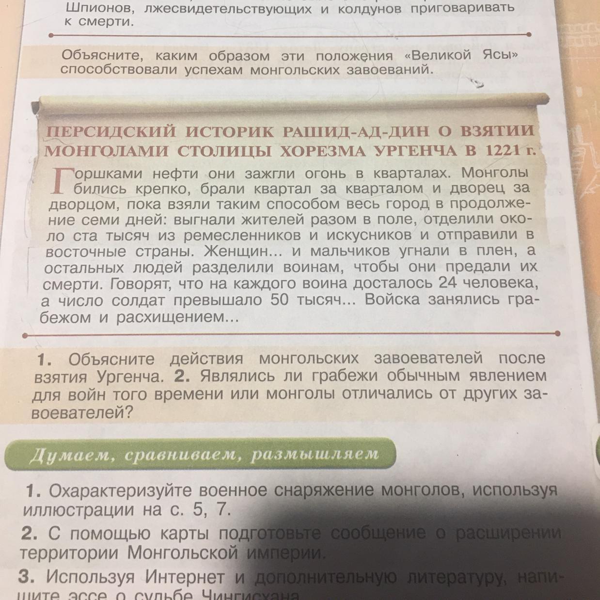 Там где написано: 1)объясните действия монгольских завоевателей после взятия Ургенча. 2) являлись ли грабежи обычным явлением для войн того времени или монголы отличались от других завоевателей?