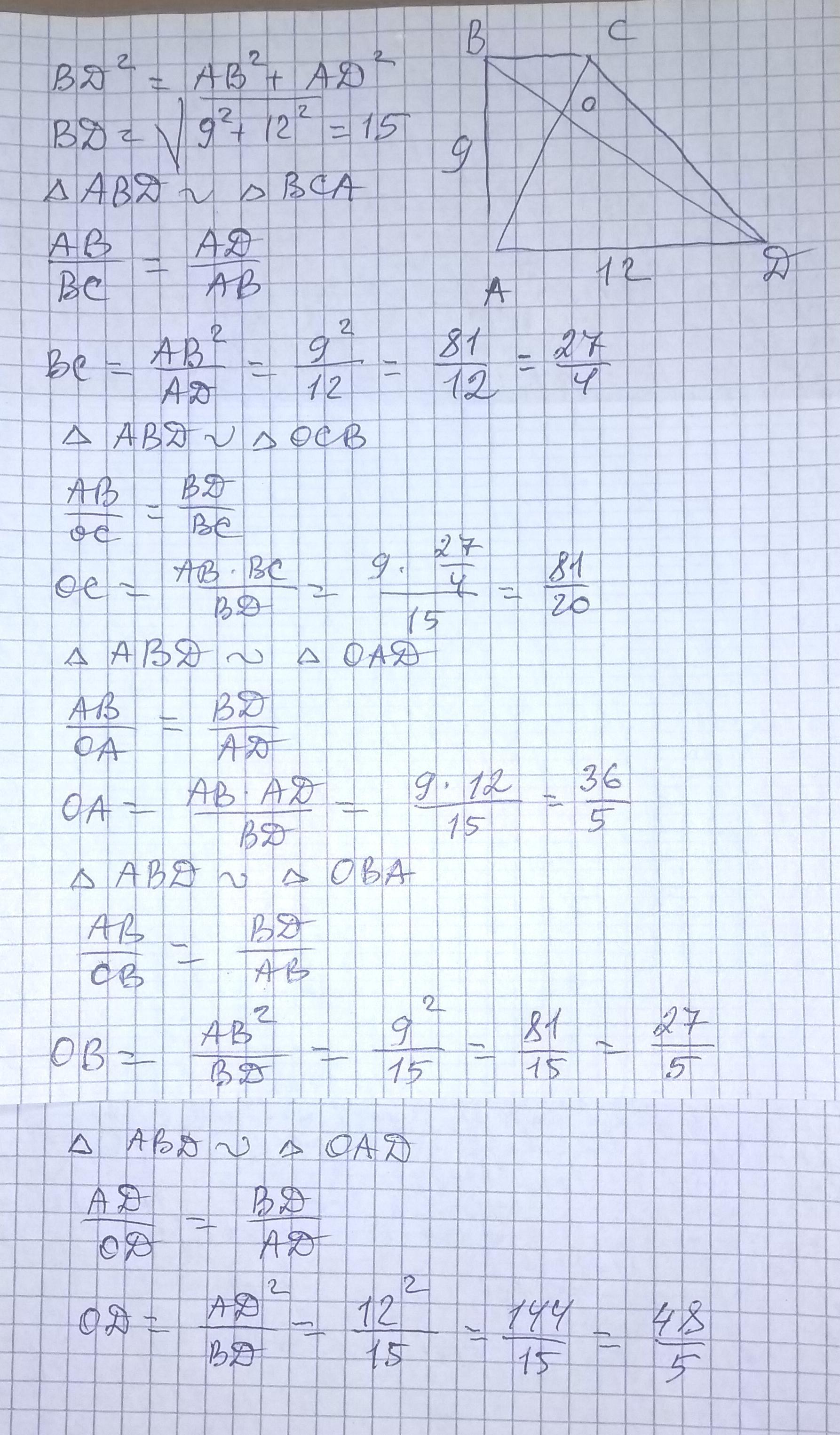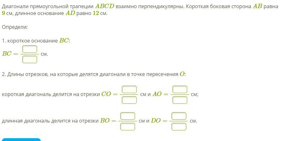 Диагонали прямоугольной трапеции ABCD взаимно перпендикулярны. Короткая боковая сторона AB равна 9 см, длинное основание AD равно 12 см.