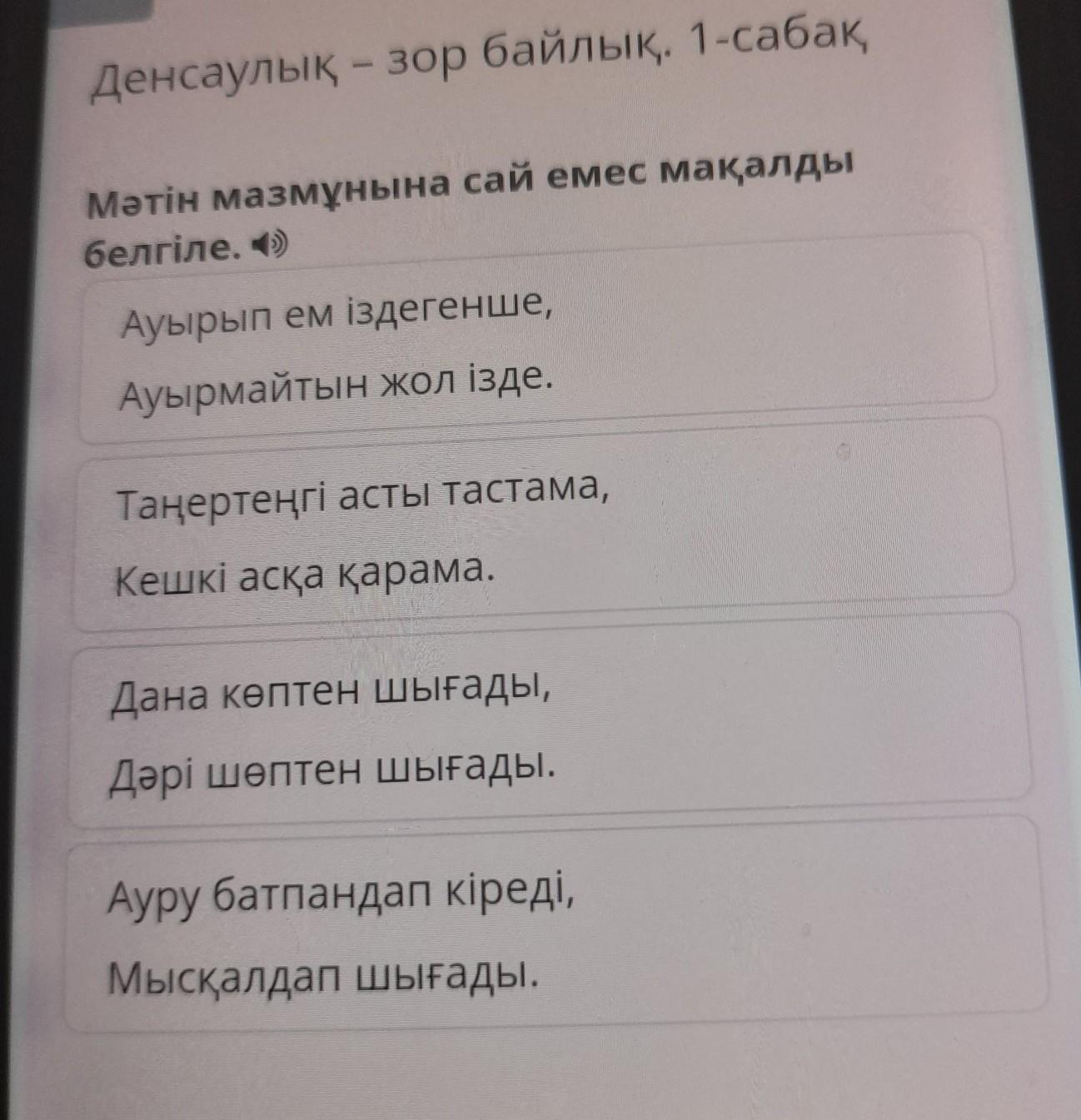 Денсаулық - зор байлық. 1-сабақ - Мәтін мазмұнына сай емес мақалды белгіле. ) Ауырып ем іздегенше, Ауырмайтын жол ізде. Таңертеңгі асты тастама, Кешкі асқа қарама. Дана көптен шығады, Дәрі шөптен шығады. Ауру батпандап кіреді, Мысқалдап шығады.Срочно 5 минуттттт