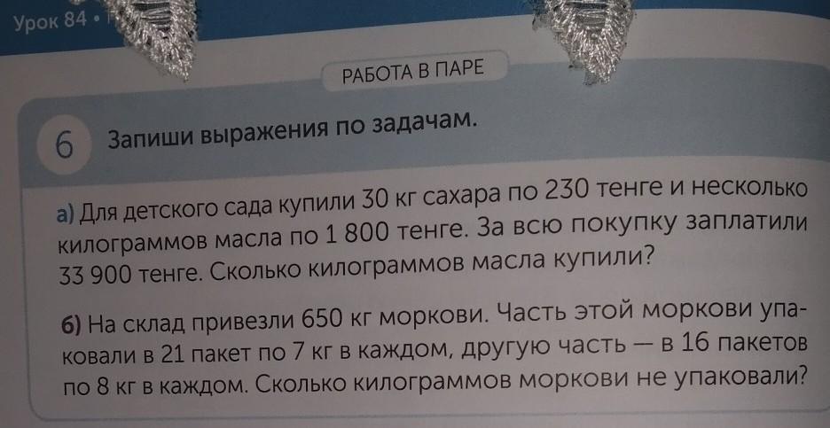 РАБОТА В ПАРЕ 6 6 Запиши выражения по задачам. а) Для детского сада купили 30 кг сахара по 230 тенге и несколько килограммов масла по 1 800 тенге. За всю покупку заплатили 33 900 тенге. Сколько килограммов масла купили? 6) На склад привезли 650 кг моркови. Часть этой моркови упа- ковали в 21 пакет по 7 кг в каждом, другую часть в 16 пакетов по 8 кг в каждом. Сколько килограммов моркови не упаковали?
