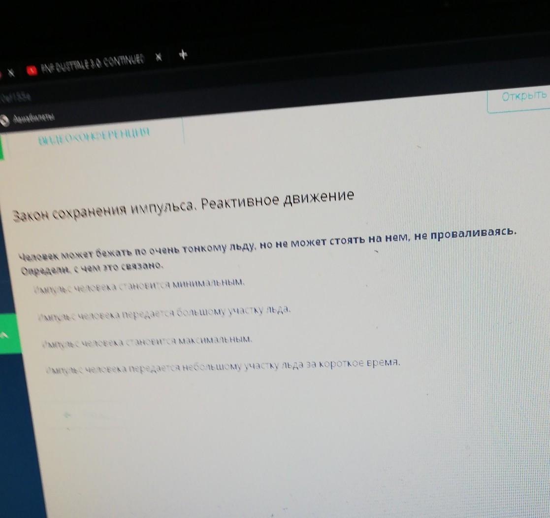 Закон сохранения импульса. Реактивное движение Человек может бежать по очень тонкому льду, но не может стоять на нем, не проваливаясь. Определи, с чем это связано Импульс человека становится минимальным. импульс человека передается большому учасу льда. Импульс человека становится максимальным. Импульс человека передается небольшому участку льда за короткое время.