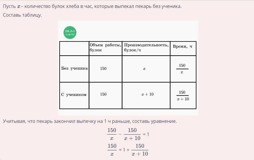 Пекарь должен был выпечь 150 булок хлеба. Ему на помощь пришел ученик, и пекарь стал выпекать в час на 10 булок больше. Поэтому пекарь закончил выпечку на 1 ч раньше. Составь несколько уравнений и определи, сколько булок хлеба в час выпекал пекарь без ученика.