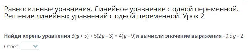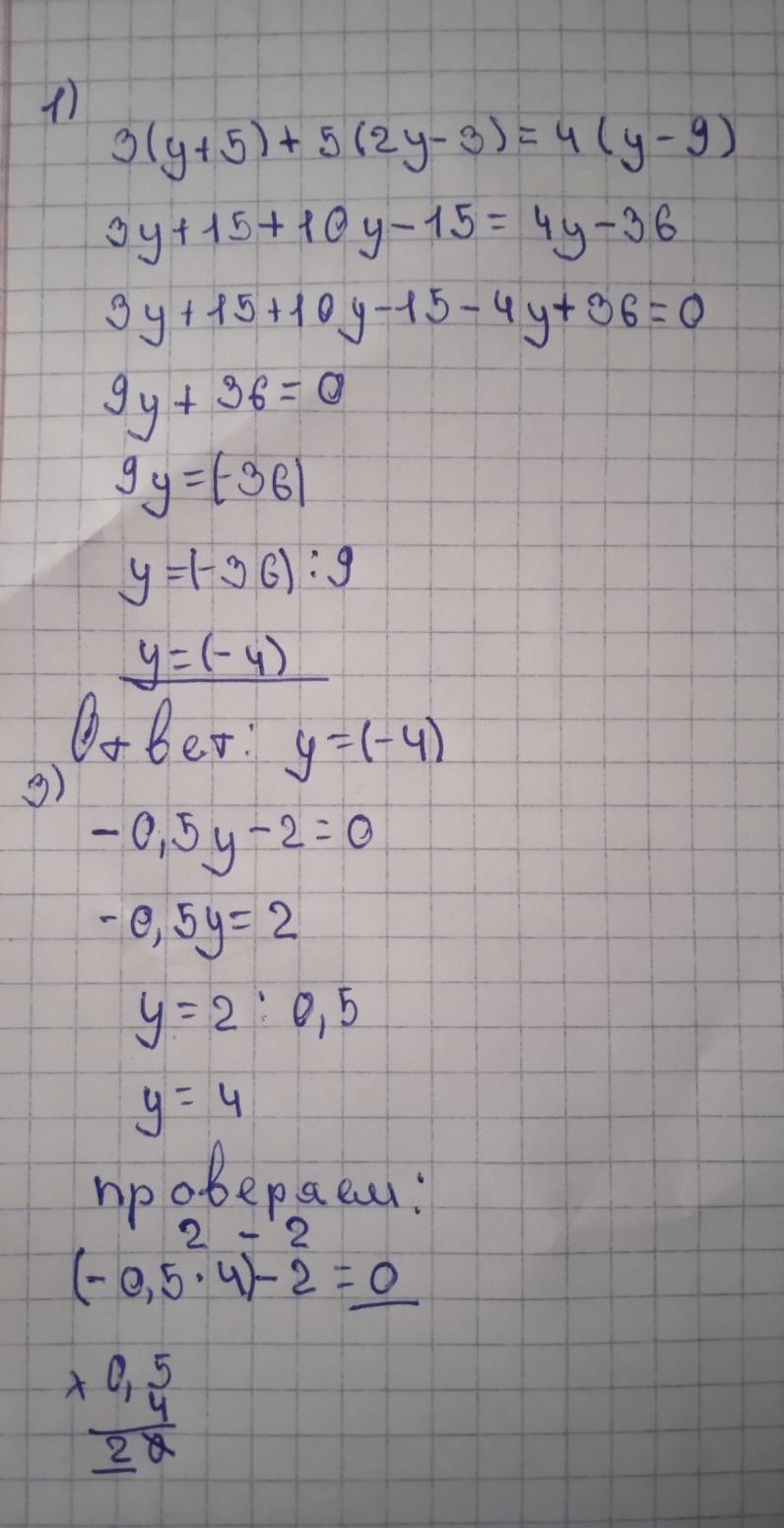 Помогите Найди корень уравнения 3(y + 5) + 5(2y – 3) = 4(y – 9)и вычисли значение выражения –0,5y – 2.