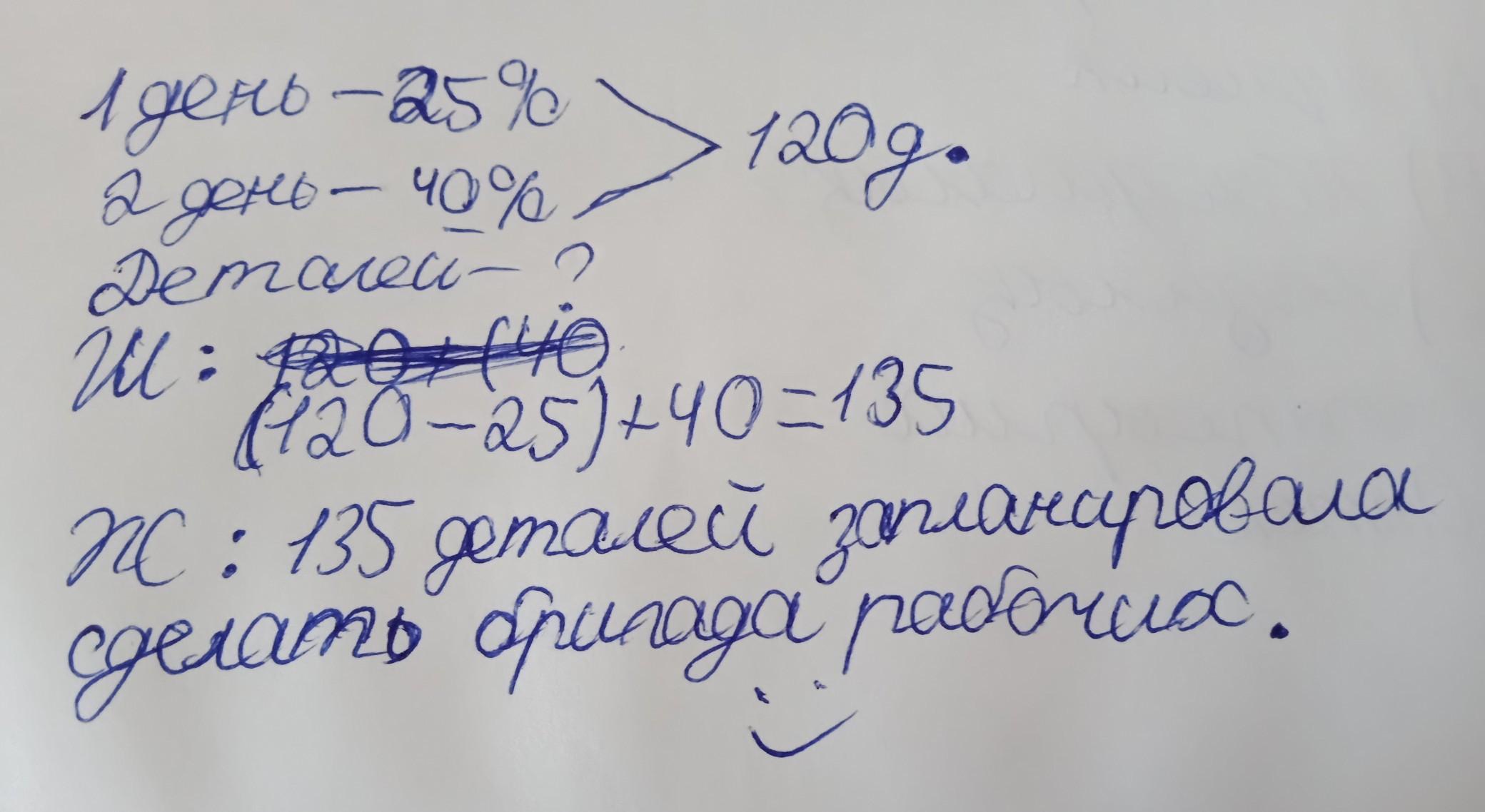 Бригада рабочих за первый день сделала 25% от запланированного количества деталей, а во второй день — 40% от оставшегося количества. Определите, сколько деталей запланировала сделать бригада рабочих, если во второй день они сделали 120 деталей