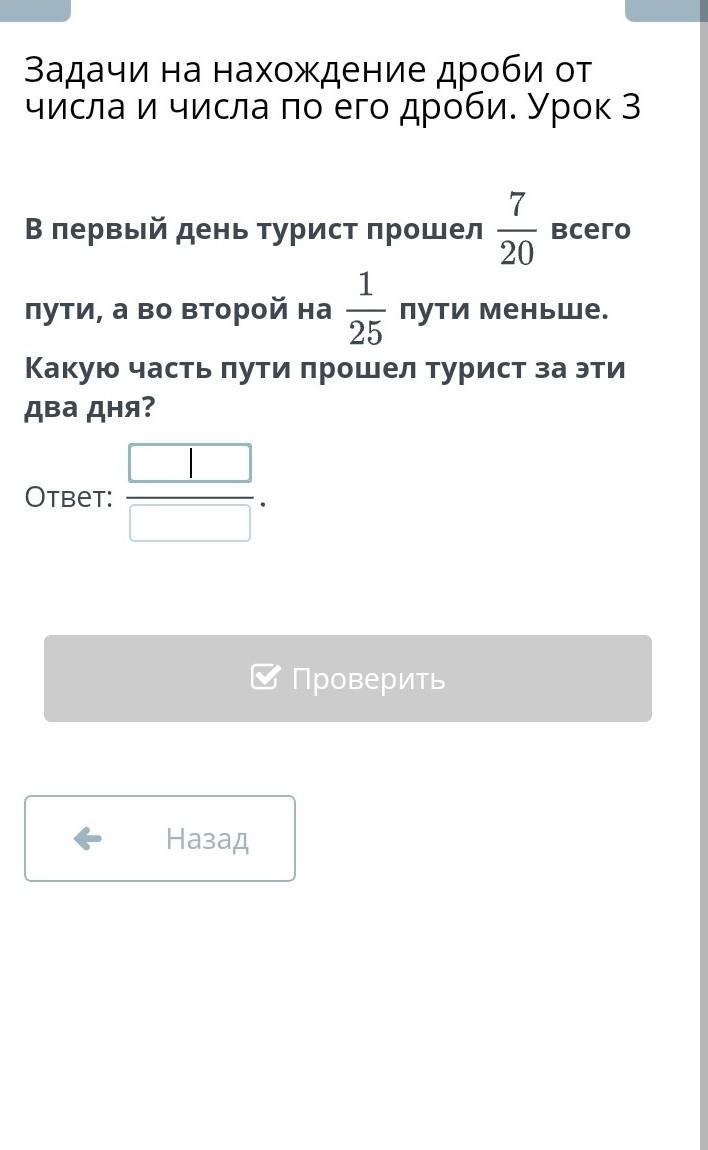 1) 7/20 - 1/25 = 35/100 - 4/100 = 31/100 (часть) - прошёл турист во 2 день