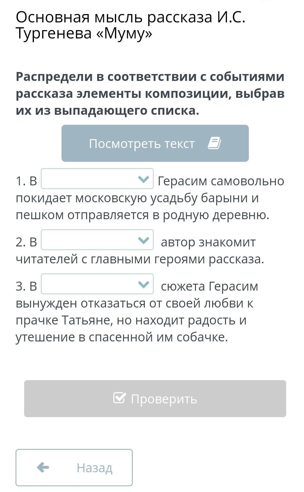 Основная мысль рассказа И.С. Тургенева «Муму» Распредели в соответствии с событиями рассказа элементы композиции, выбрав их из выпадающего списка. Посмотреть текст 1. В Герасим самовольно покидает московскую усадьбу барыни и пешком отправляется в родную деревню. 2. В автор знакомит читателей с главными героями рассказа. 3. В сюжета Герасим вынужден отказаться от своей любви к прачке Татьяне, но находит радость и утешение в спасенной им собачке. Назад Проверить