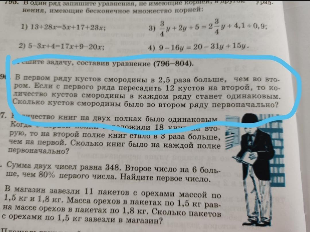 пусть изначально во втором ряду было х кустов, тогда в первом 2,5х После пересадки получилось в первом ряду 2,5х-12,а во втором ряду х+12 Составим уравнение