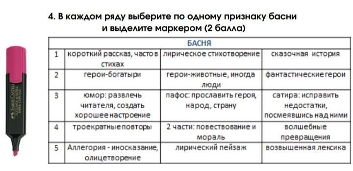 каждом ряду выберите по одному признаку басни и выделите маркером , помогите СРОЧНО