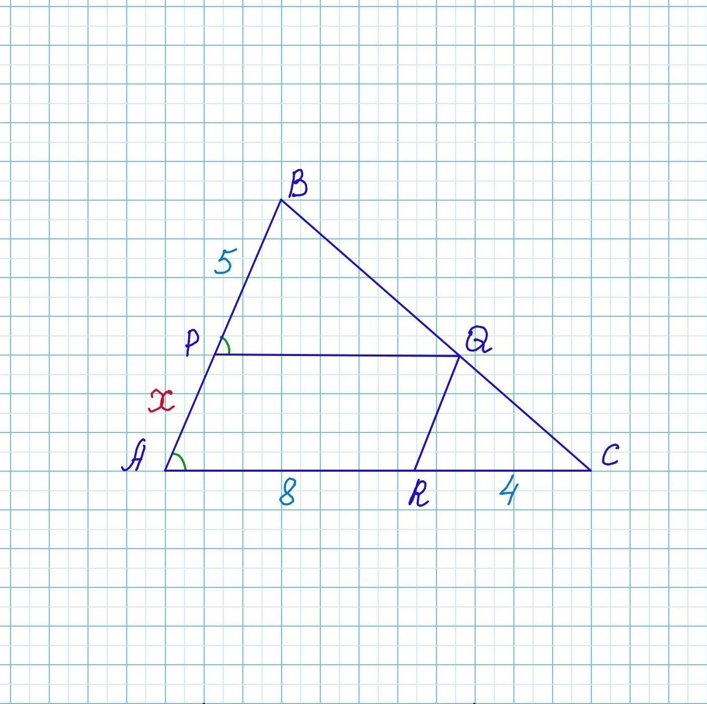 На сторонах AB, BC и CA треугольника ABC выбраны точки P, Q и R соответственно таким образом, что PQ ∥ AC, а QR ∥ AB. Найдите отрезок AP, если BP = 5, AR = 8, RC = 4.