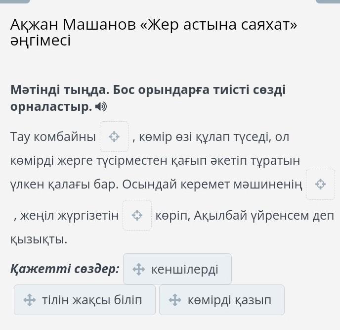 Ақжан Машанов «Жер астына саяхат» әңгімесі Мәтінді тыңда. Бос орындарға тиісті сөзді орналастыр. Тау комбайны , көмір өзі құлап түседі, ол көмірді жерге түсірместен қағып әкетіп тұратын үлкен қалағы бар. Осындай керемет мәшиненің , жеңіл жүргізетін көріп, даю 10 балов