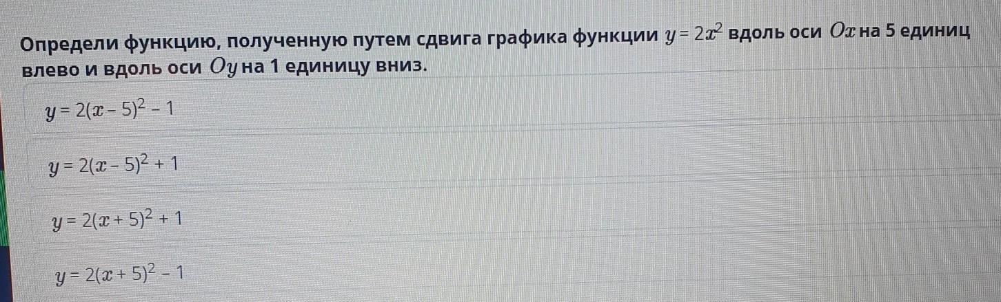 СРОЧНО ПЖ.Определи функцию, полученную путем сдвига графика функции y =2х² вдоль оси Ох на 5 единиц влево и вдоль оси Оу на 1 единицу вниз.