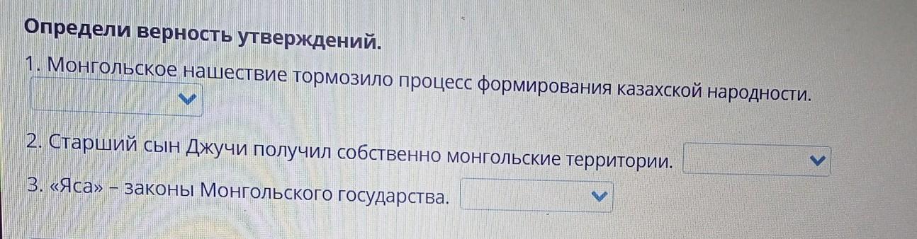 Последствия монгольского завоевания Определи верность утверждений. 1. Монгольское нашествие тормозило процесс формирования казахской народности, 2. Старший сын Джучи получил собственно монгольские территории. 3. «Яса» - законы Монгольского государства.
